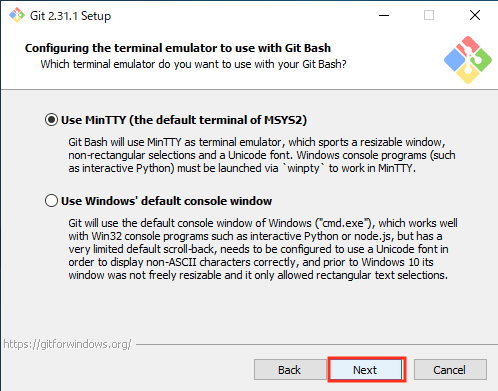 Git Bash使用時のターミナルの設定が表示されます。Git Bashは使いませんので、そのまま「Next」ボタンを押します。