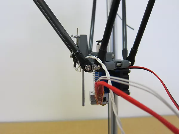 次に、アルミ棒を引き上げ、Zプローブのストッパー部にアルミ棒のL字短辺を引っ掛けます。この時、アルミ棒L字長辺の先端が、ホットエンドのノズル先端よりも上にある事を確認します。下になっている場合、ニッパーでアルミ棒の先端をカットして調整します。少しずつ調整し、上の写真の時はノズル先端よりも下、下の写真の時はノズルより上になるようにします。