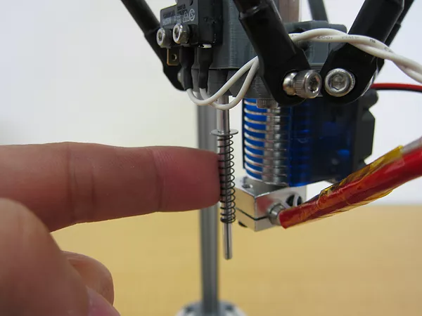 次に、安全ピンの調整を行います。ピンセットの平らな面などでアルミ棒の先端を押し上げると、安全ピンによってZプローブのストッパー部へ収まるようにします。安全ピンの傾きを変えたり曲げたりして調整します。