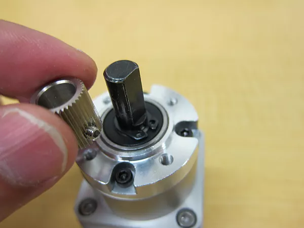 スプールを止めネジ側が下になる向きで、エクストルーダー用モーターの軸に差し込みます。スプールとモーターの隙間が2mm程度になるようにスプールの位置を調整して、止めネジを締めます。