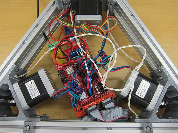 ヒートベッドを奥のアルミフレーム(Z軸)に立て掛けます。サーミスタ用ケーブル(白)が上部へくるようにします。