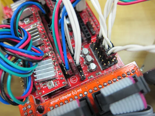 ※緑色のコネクタの上部2つがヒートベッドで使用する12V11Aの端子で、下部2つがそれ以外で使用する12V5Aの端子です。極性は、それぞれ上側がプラス、下側がマイナスとなります。