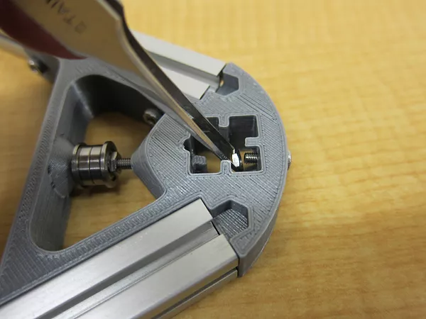 トップフレームの外側から穴にM3-8ボルトを挿入します。ピンセットもしくはラジオペンチでM3ナットをはさみ、M3-8ボルトの先端付近へ持って行きます。