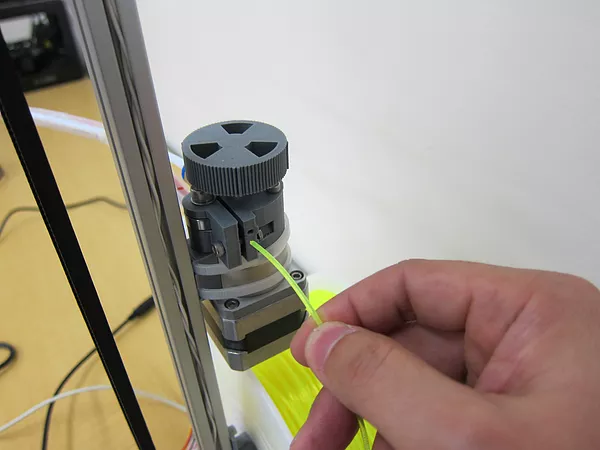 エクストルーダーハンドルを時計方向に回します。スプールギアによって、フィラメントが中に通って行くのを確認します。そのままハンドルを回し、ホットエンドにフィラメントが到達するまで回し続けます。